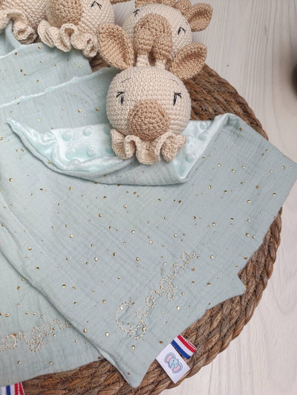Vous avez la possibilité de broder à la main / floquer un prénom ou un petit mot doux. Le prénom sera apposé en bas du doudou.