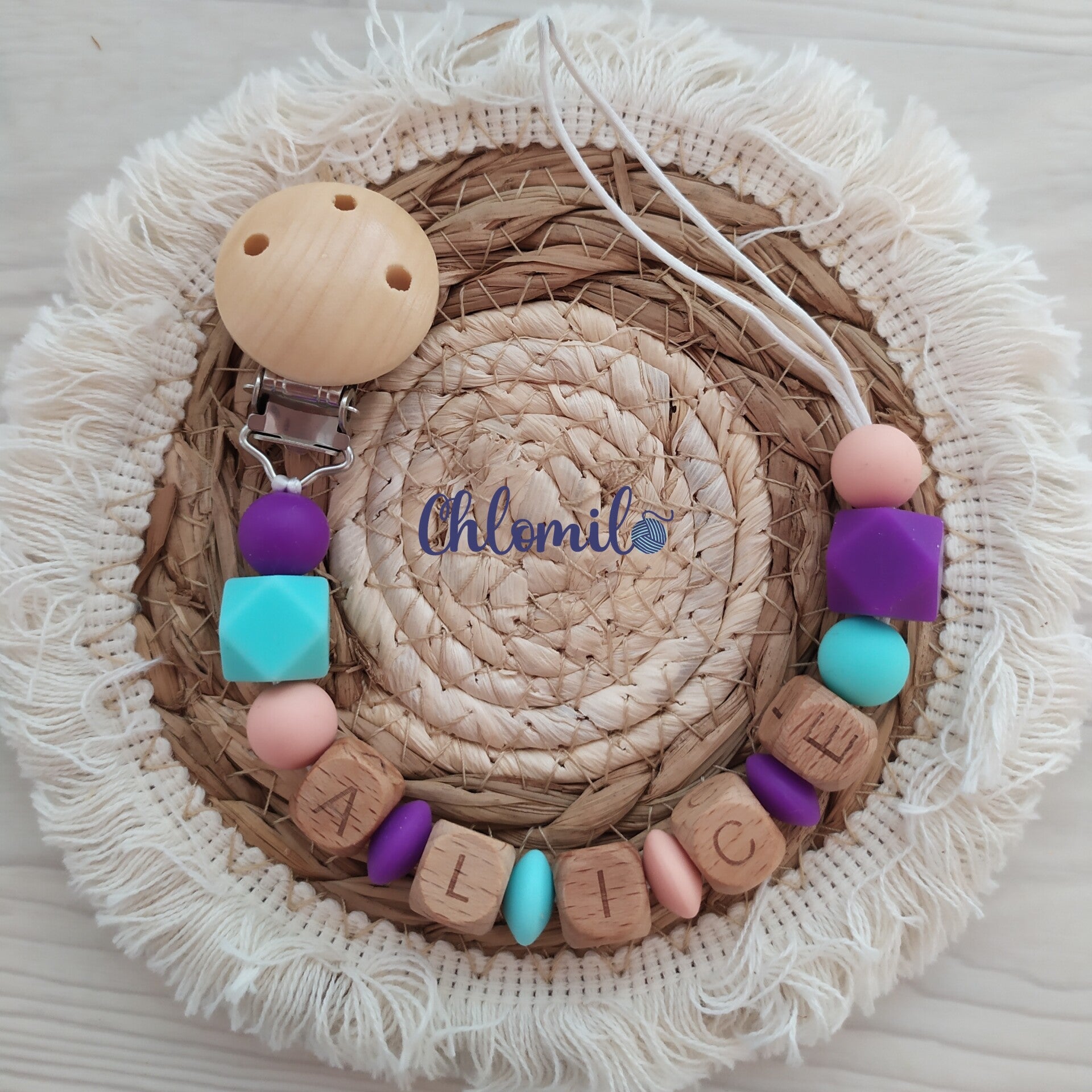 - Coloris au choix: vous pouvez choisir la couleur des perles ainsi que la matière des lettres (silicone ou bois).