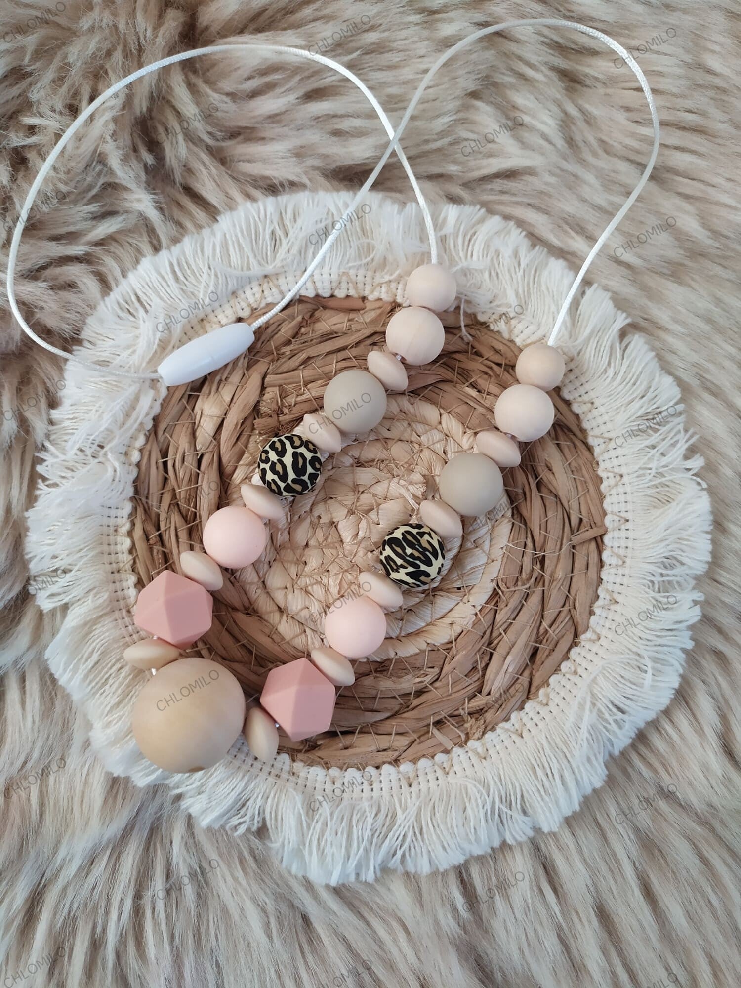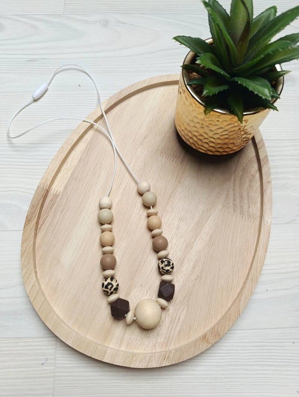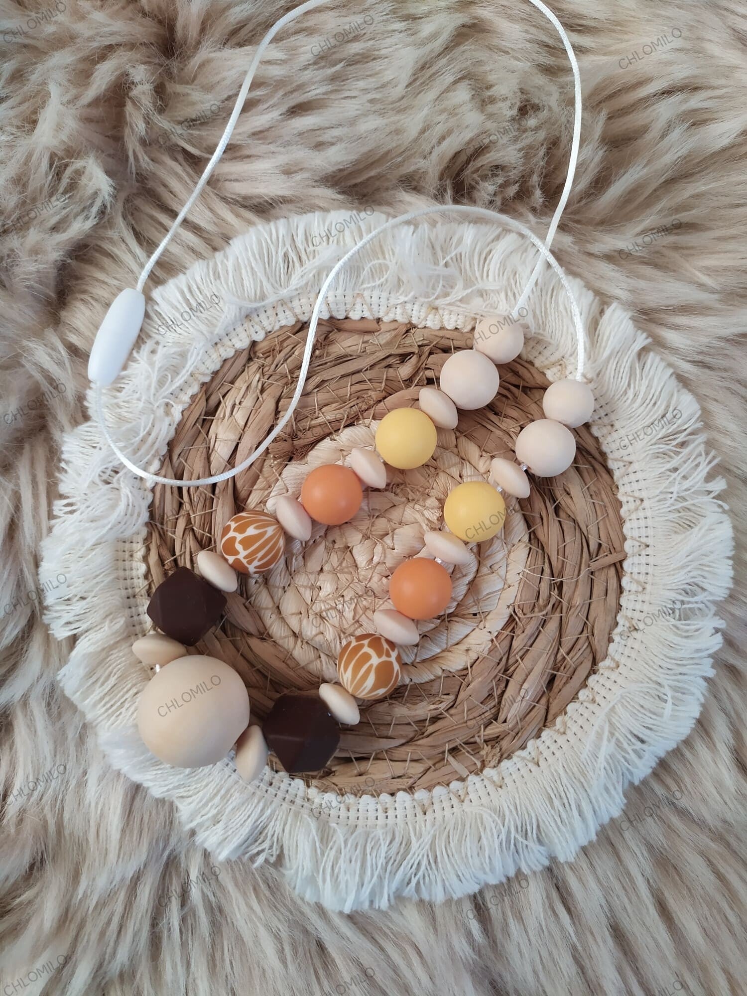 Collier d'allaitement et de portage confectionné avec des perles en bois naturel et silicone.