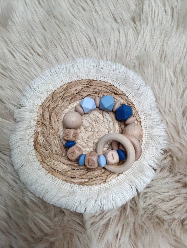 - Le duo bois comprend une attache tétine avec prénom et un anneau de dentition avec prénom.
