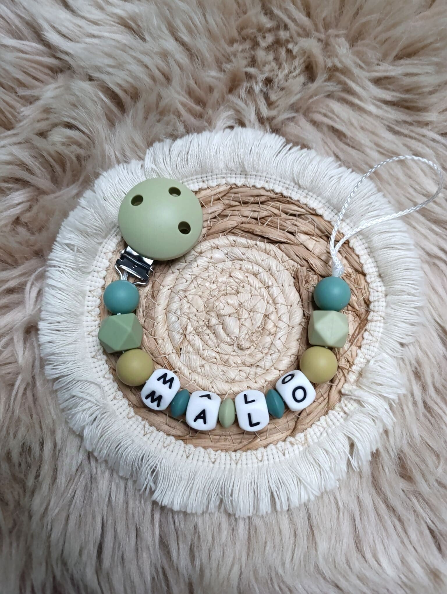 - Le duo silicone mixte comprend une attache tétine avec prénom et un anneau de dentition sans prénom.