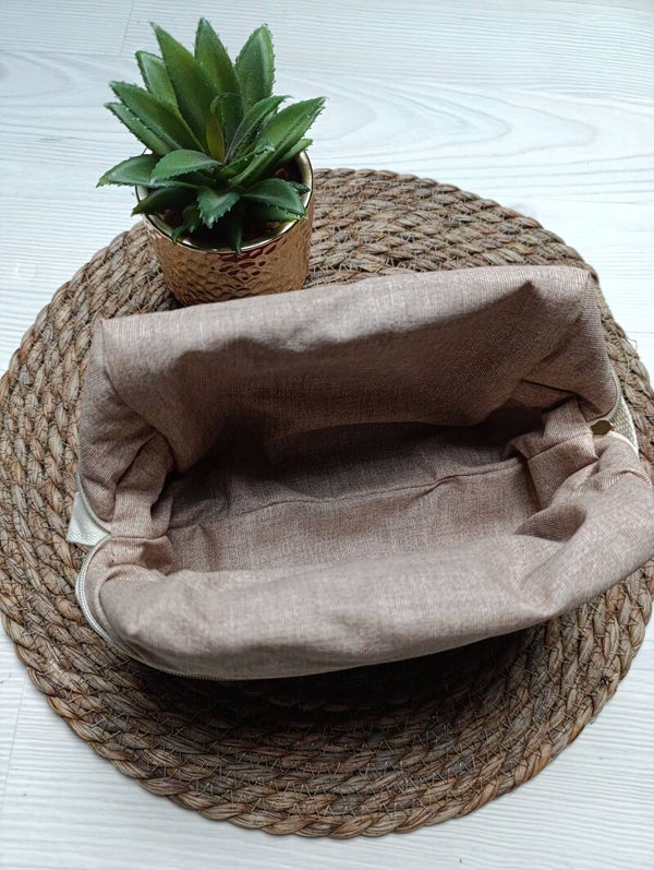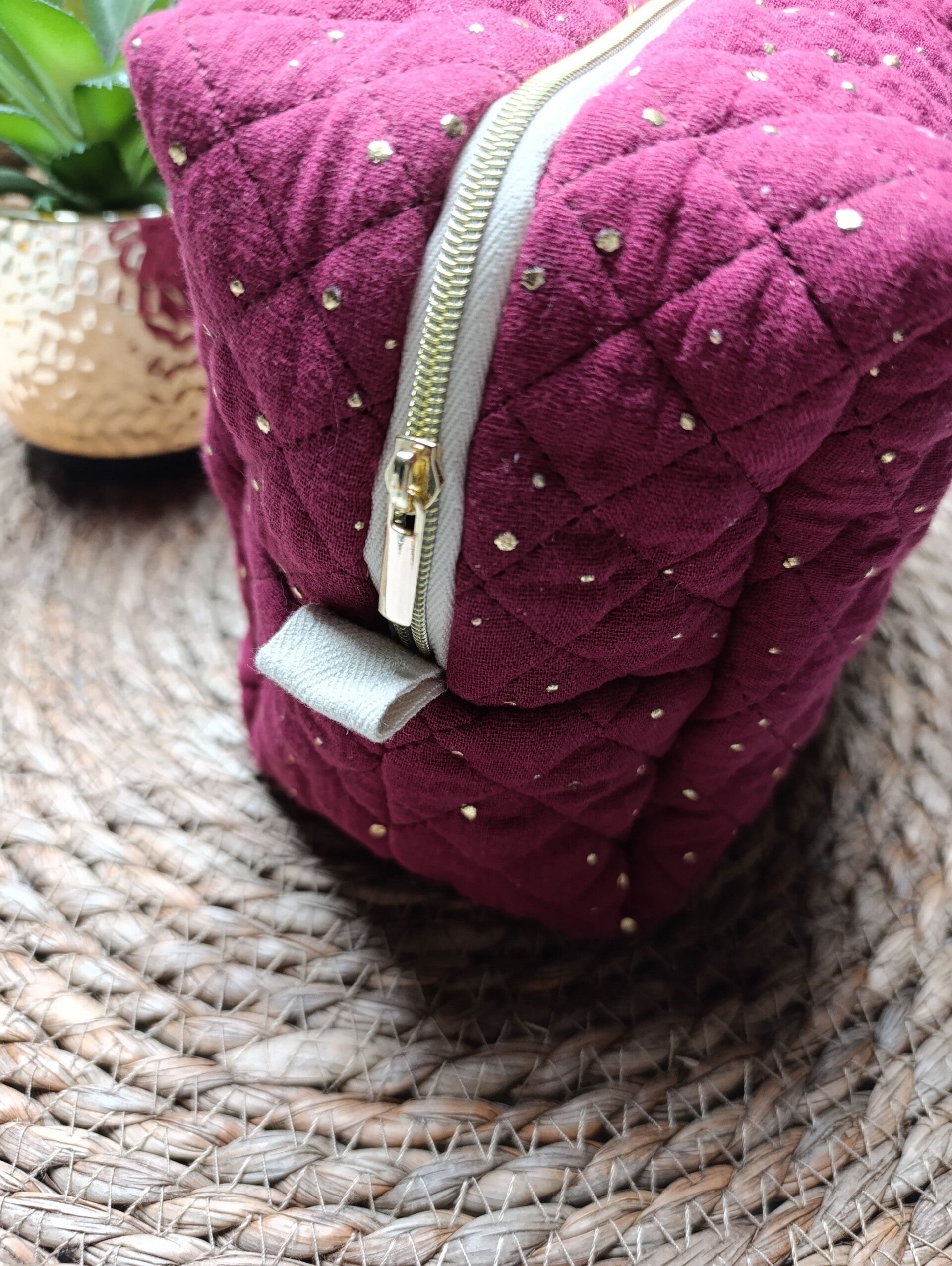 Tissu extérieur double gaze de coton glitter couleur prune, tissu intérieur imperméable couleur lin