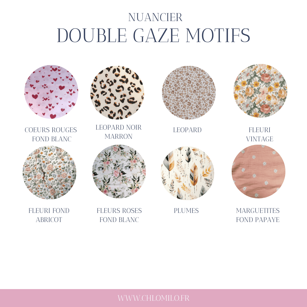 Vous pouvez choisir les tissus dans LA TISSUTHEQUE parmi double gaze de coton et coton imprimé, pour les tissus avec plusieurs animaux n'hésitez pas à me préciser si vous en voulez un en particulier.