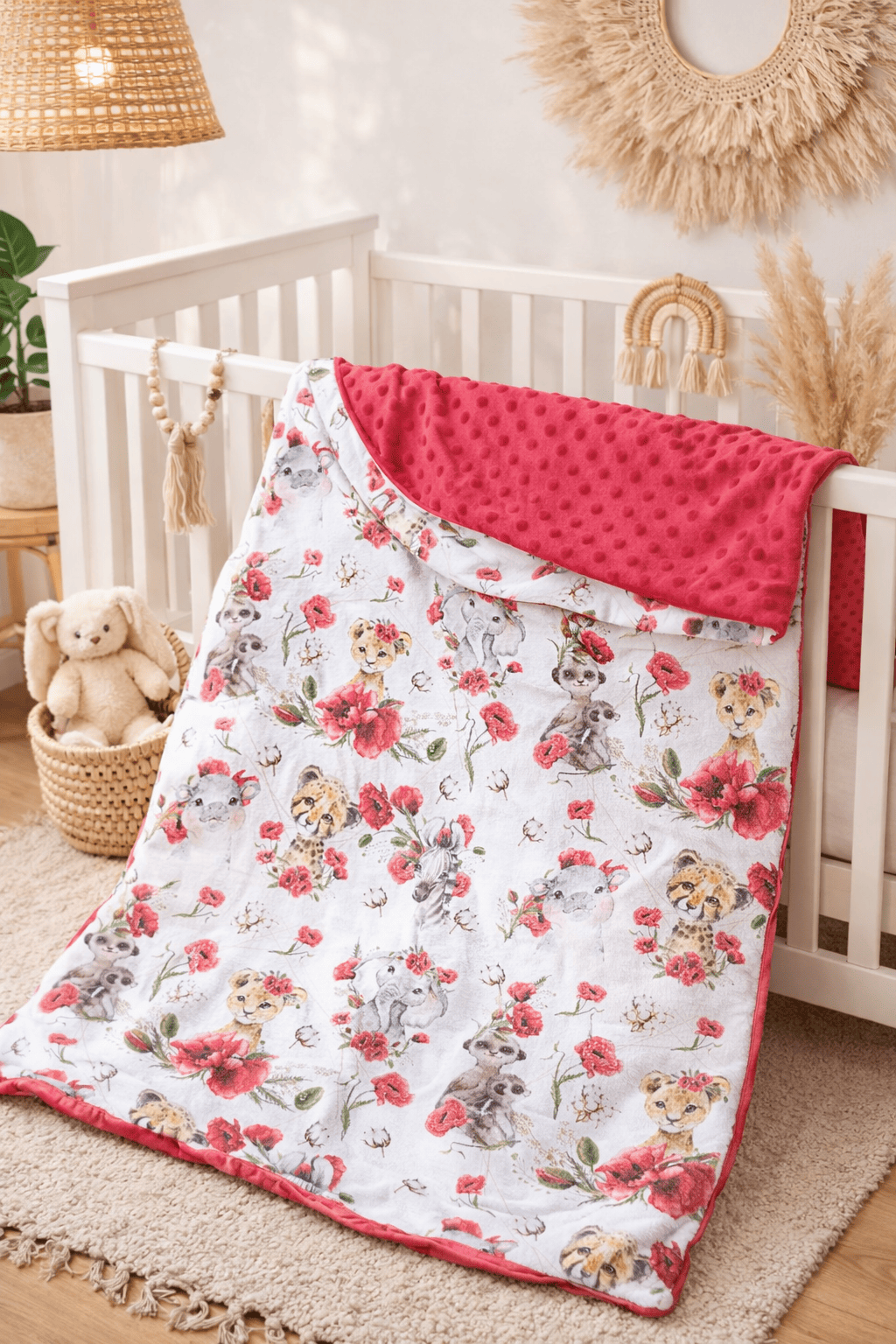 Couverture en double gaze de coton savane coquelicots et minky rouge