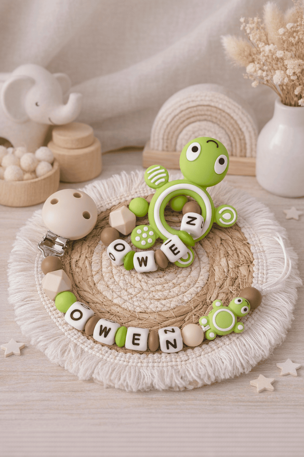 • Le duo comprend une attache tétine et un anneau de dentition avec prénom.