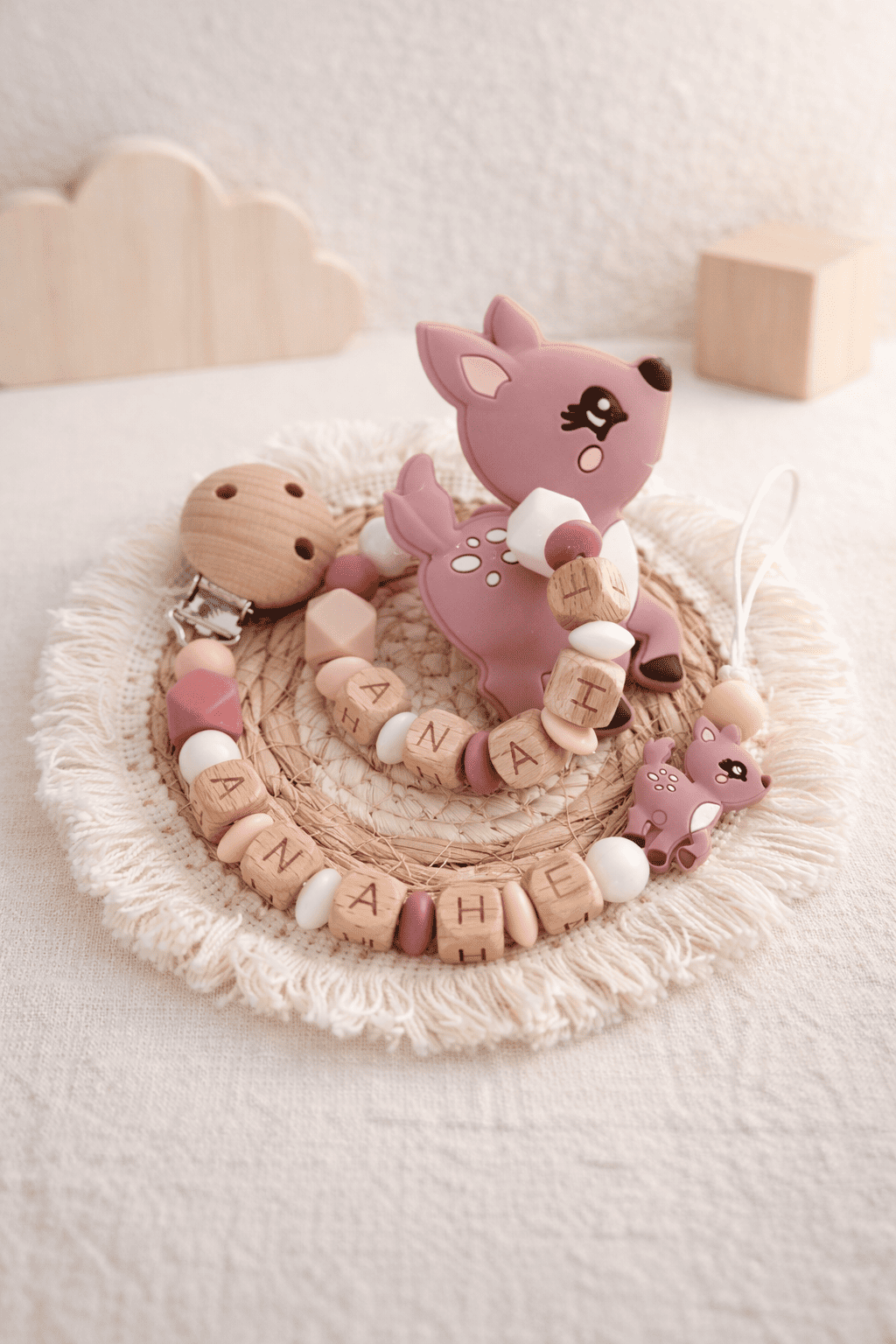 • Le duo comprend une attache tétine et un anneau de dentition avec prénom.